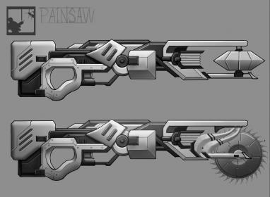 I really like the small details you put in, like the textured grip and the markings on the rear of the weapon. I would say that everything prior to the blade looks very good. The blade itself looks good too, but I would like to see a couple of variations. Maybe try a vertical saw blade to see how that would go.